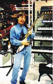 While at NAMM 2000, Tom checked out a few different guitars, including the shark-shaped one he's jamming on above and to the right. Although closed to the general public, NAMM is a virtual Toyland for industry musicians that want to play with new and interesting stuff.